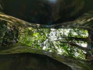 内部で横を見ると木がすんごい角度で生えとる。